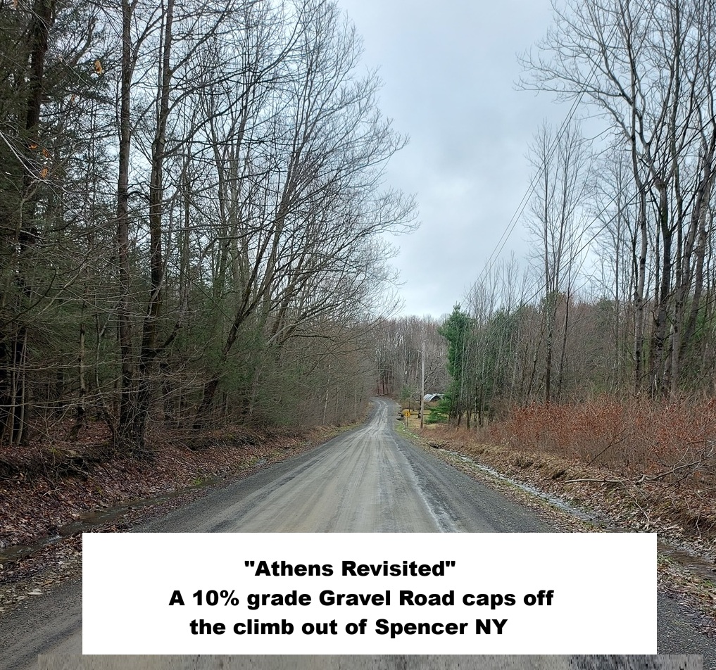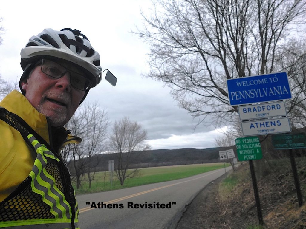 The first day went completely according to plan – after a smooth early-morning drive and Buffalo border crossing, I started the Athens Revisited permanent almost on the stroke of 11 am. Temperatures were very cool, and the wind made it feel even chillier. I was disappointed when I passed by the “Owego Donut & Beer Company” too early in the ride to warrant investigation. I’m sure I’ll be back. The roads on this first permanent Populaire were great, and the rural hilly scenery was wonderful. As I left the single major climb of the route behind me and crossed the NY/PA border, I knew states #8 and #9 were in the bag. But on this cool early-season ride, my septuagenarian legs were complaining, and my 17 km/hr moving average did not allow for any sight-seeing stops. Getting back to Owego, I was grateful for a celebratory Yuengling and a good night’s sleep. [Permanent #1 on Strava]