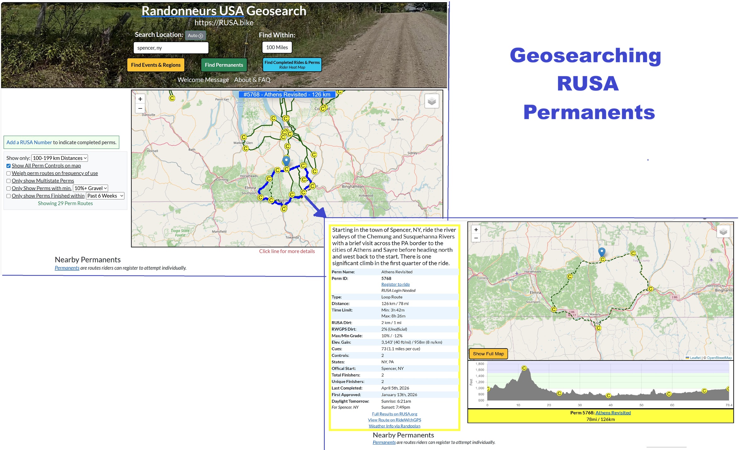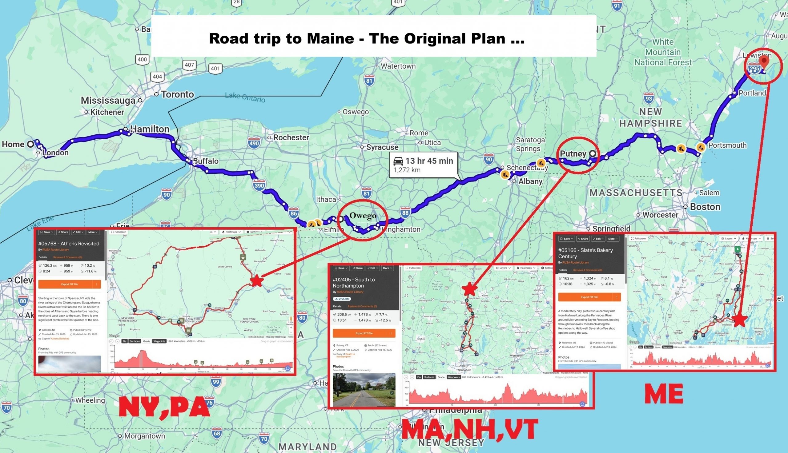 So I began to tinker with the Google maps driving route to Bath, Maine, and with the excellent RUSA resources for identifying Permanents in the vicinity of the driving route. Through a number of iterations, I gradually landed on a plan for a multi-day, three-permanent journey which would give me six “new” states for the American Explorer. For example, I found the recommended driving route went through Spencer NY, the starting point for a 126 km (958 m) “permanent Populaire” route (Athens Revisited) touching into Pennsylvania. After looking at available hotels in Spencer and in Owego, NY (another Control on the Athens Revisited route), I decided to target Owego as my starting point. If I started driving from home at 4 am, I should be able to make Owego and start the permanent ride by 11 am. With 8 hrs 26 minutes available to complete the ride, I’d be back to my hotel in daylight. The second day would be a relaxed drive to Putney VT, where I’d get a good night’s sleep before tackling the 206 km (1,476 m) South to Northampton permanent, touching on VT, NH, and MA. Three states in one ride! What could go wrong? After completing the 3-state ride, I’d hop in the car to drive to Bath, ME where (the following morning) I’d head out on the 161 km (1,324 m) Slate’s Bakery Century to give me a total of six new US states.